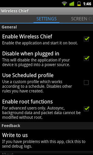 Wireless Chief is an application designed to control the wifi and data radios in your device, as well as many related functions like background data and autosync. It can be used to save power or minimize data usage, and works either by reading the screen state or on a completely custom schedule.
